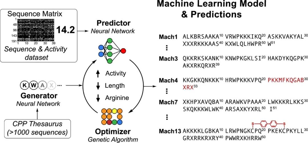 在细胞穿膜活性与合成便捷性的优化研究中,我们使用基于 TensorFlow 的机器学习框架 Peptimizer 对肽进行了设计。从概念上来说,Peptimizer 能够生成氨基酸序列,然后预测肽的性质,接着优化该序列。