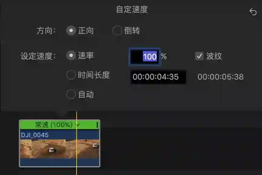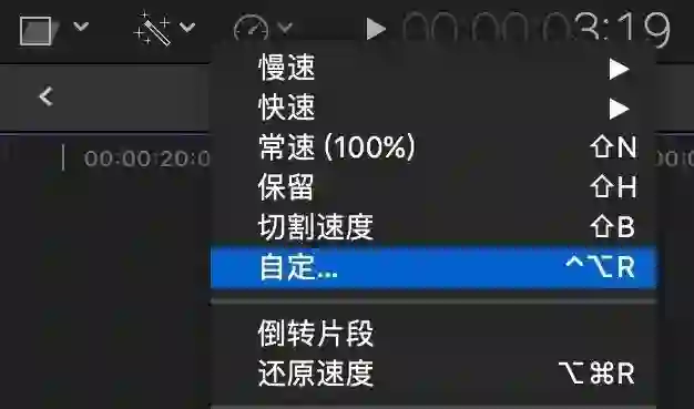 4. 点击这个仪表的小按钮,选择自定速度。(快捷键 Control+Option+R 也可以直接调出速度调整画面)