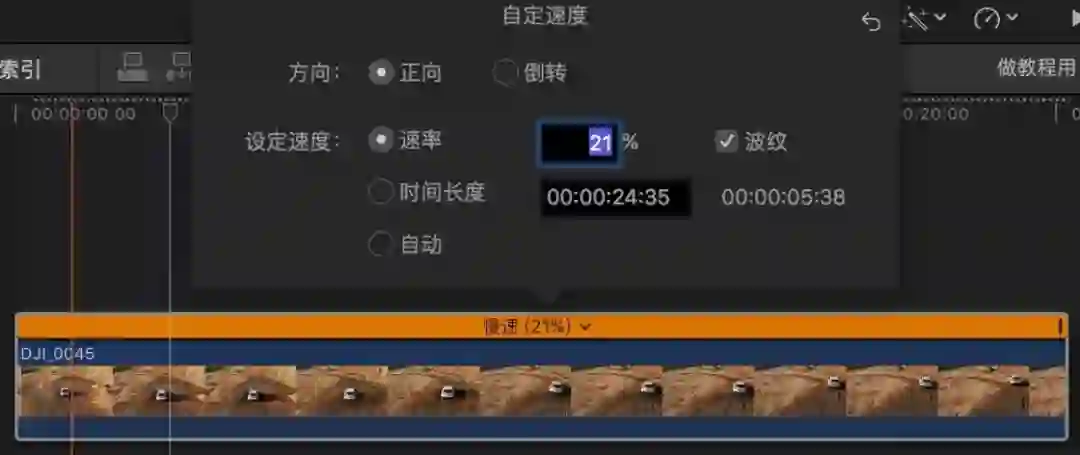 5. 由于拍摄的是 120 帧的素材,在 25 帧的时间线上播放,将素材速率降到 20.8% 左右,在这里降速到 21%(低于 20.8% 将会发生“掉帧”现象)。