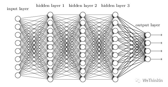 例如下面所示的含有三个隐藏层的神经网络,梯度消失问题发生时,接近输出层的hiden layer3的权重更新比较正常,但是前面的hidden layer1的权重更新会变得很慢,导致前面的权重几乎不变,仍然接近初始化的权重,这相当于hidden layer1没有学到任何东西,此时深层网络只有后面的几层网络在学习,而且网络在实际上也等价变成了浅层网络。