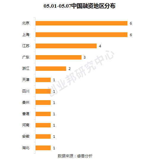本周北上广融资事件共15起,占比53.57%;江苏有4起事件,超越广东位列第3名;浙江有2起事件。