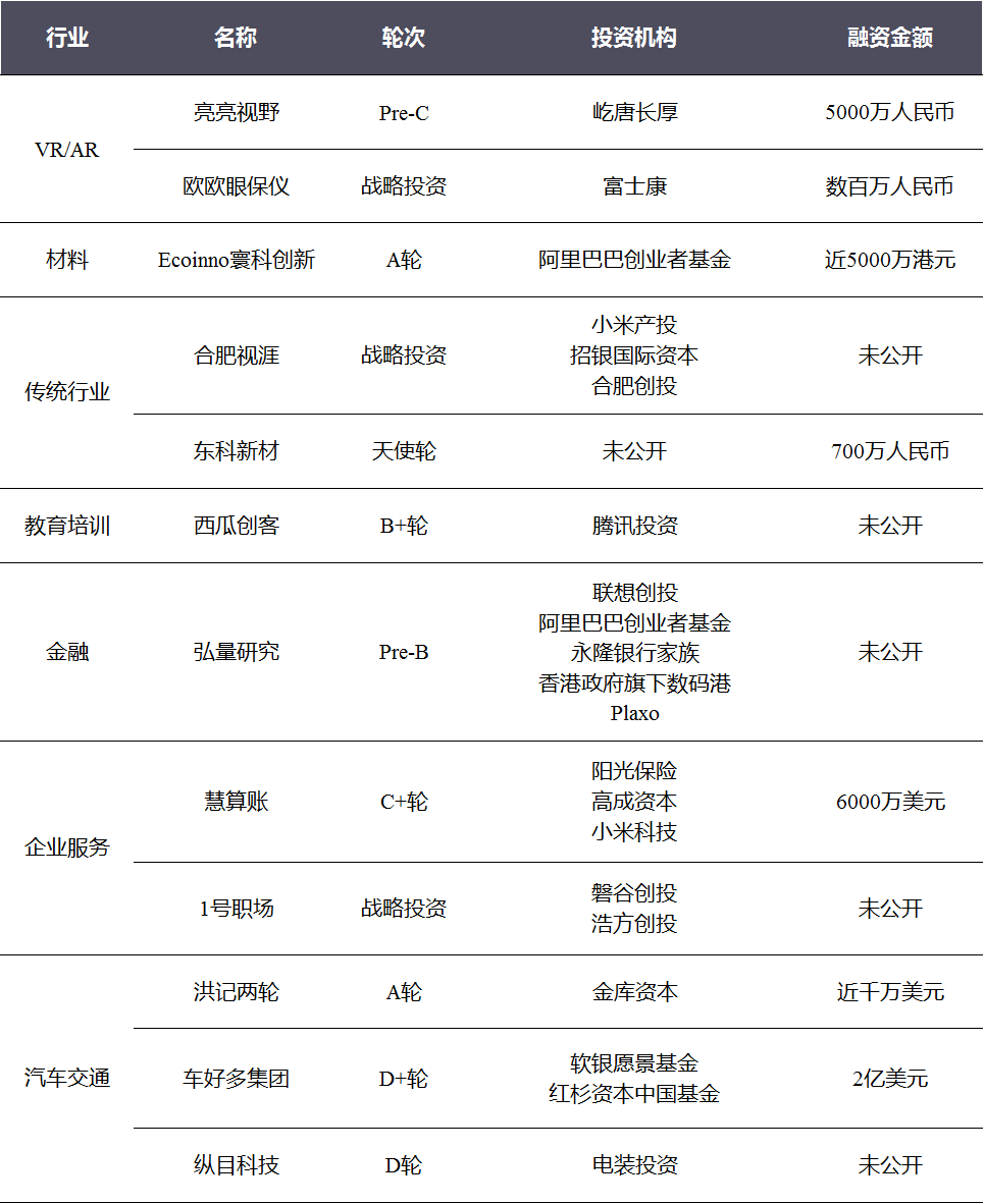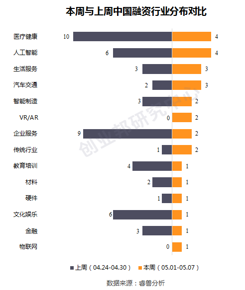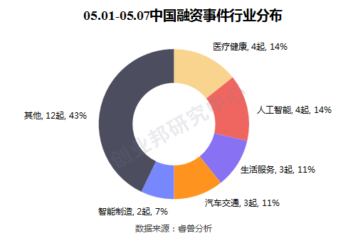 本周披露国内融资事件涉及14个行业领域,其中医疗健康、人工智能并列4起,生活服务、汽车交通并列3起,智能制造、VR/AR、企业服务、传统行业并列2起。