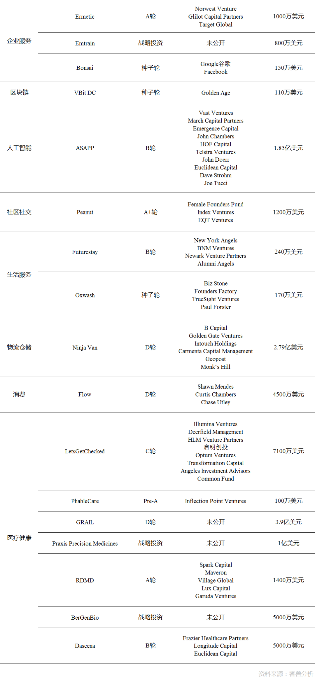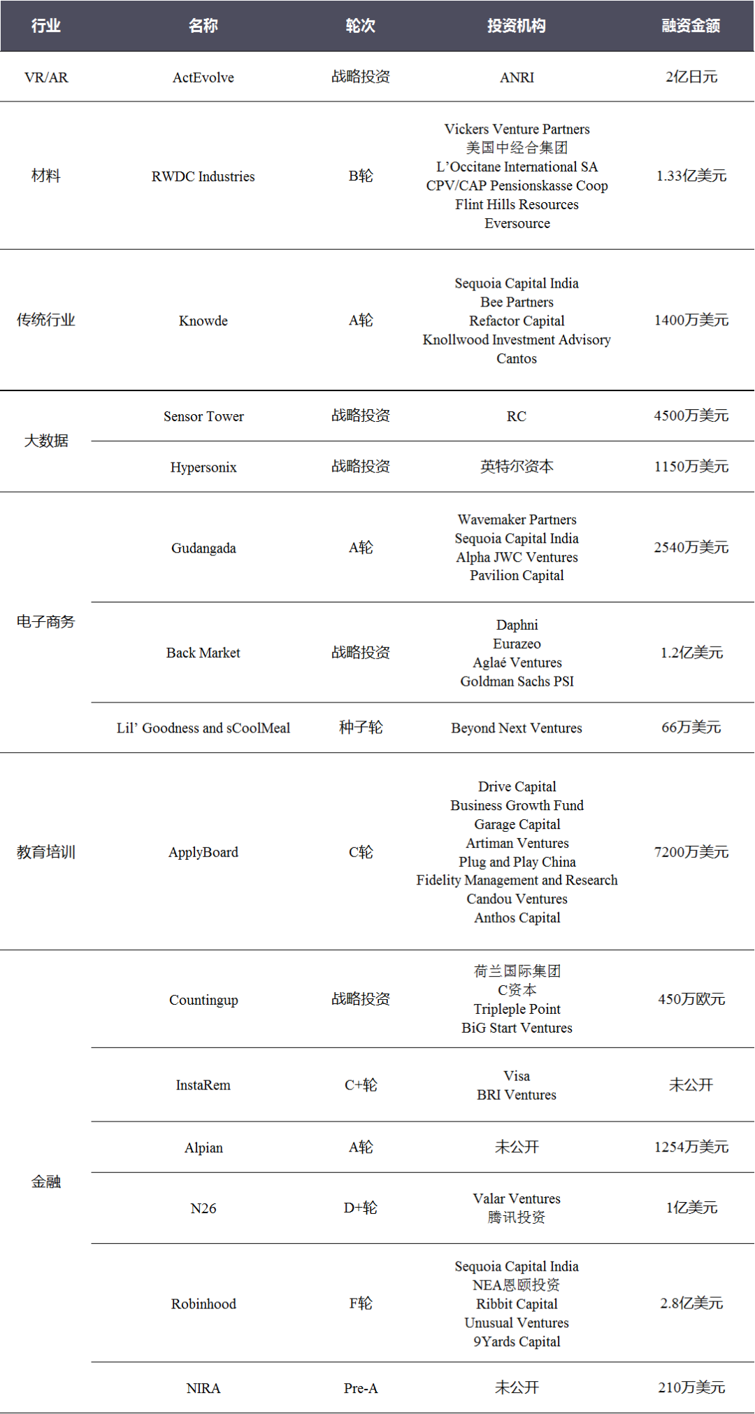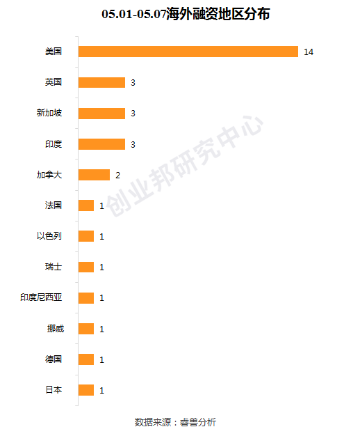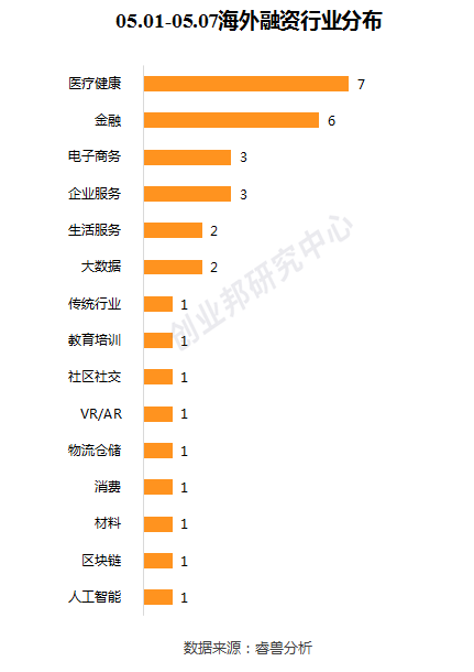 本周披露海外融资事件涉及15个行业领域,其中医疗健康7起,金融6起,电子商务、企业服务并列3起,生活服务、大数据并列2起。