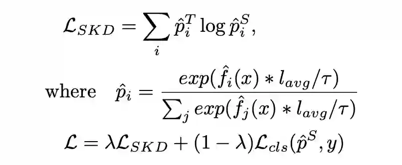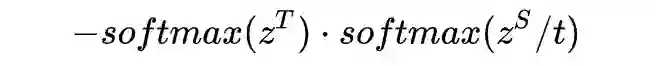 对 Student Model 的 logits 升温后的交叉熵损失:采用一个广义的 softmax 函数,T 为温度,值越大,输出的概率分布越平缓,越小则分布越陡峭,当 T=0 时就变成了 one-hot 编码。在做 inference 时 T=1,在做训练时为大于 1 的某个数。