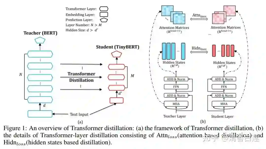 BERT 的蒸馏方法已经有过很多研究,如 BERT-PKD、DistilBERT 以及 TinyBERT 等,这些方法的卖点主要在 loss 的设计上。这里介绍下 TinyBERT 的 Loss 设计,应该说考虑的比较全面主要包含三大块:Attention Loss,Hidden Loss 与 Embedding Loss。