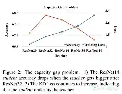 在知识蒸馏问题中,并非 Teacher Model 越好 Student Model 就越好。当 Teacher Model 比 Student Model 大很多时,Capacity Gap 问题将会变得非常严重。下图中的 Student Model 都是 ResNet14,当 Teacher Model 的体量超过 ResNet32 时,蒸馏的结果却出现了明显的 drop。同时 KD Loss 随着 Teacher Model 的增大而不断增加,说明 Student Model 对 Teacher Model 的模仿能力或者拟合程度越来越低。