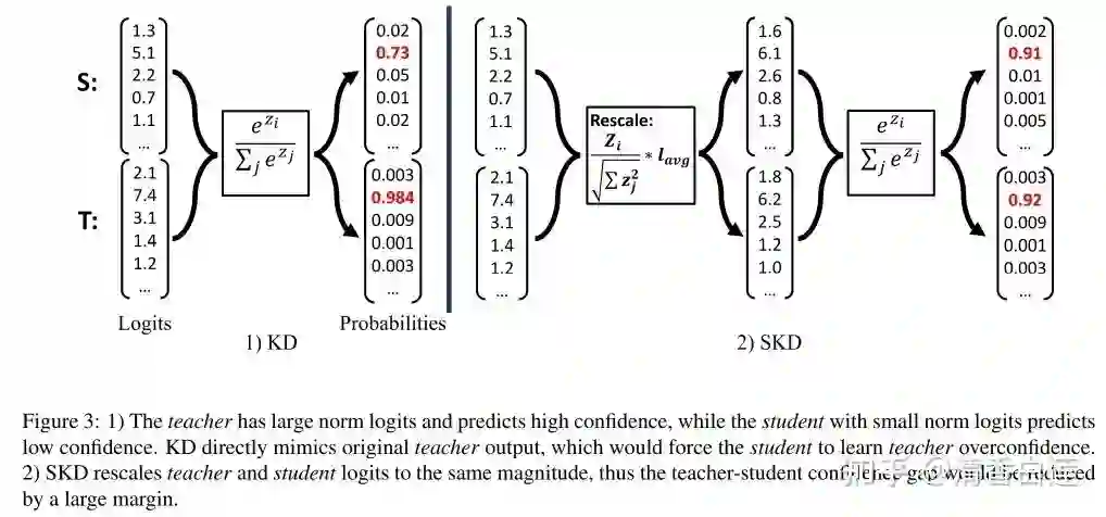 一般随着模型的增大,会对预测的 label 更加 confident,即分配更高的概率。如下图左侧,Teacher Model 对预测的 label 分配的概率时 0.984,而 Student Model 分配的概率是 0.73。而常规的知识蒸馏使用了 Soft Target,即让 Student Model 去学习 Teacher Model 的输出概率分布,然而 Student Model 在体量上的劣势就注定了它很难在这方面向 Teacher Model 看齐。