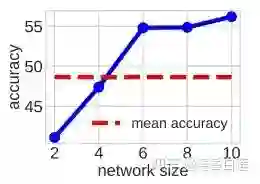 那么 TA 的 size 选多少合适呢?一般并不是选择两者体积的平均,而是在各自单独训练的情形下,性能介于 Teacher 与 Student 之间的网络的 size。例如,在下图重蓝色的折线表示随着模型层数的增加,模型的准确率,如果 Student 是两层,Teacher 是 10 层,那么 TA 应该选 4 层,因为它的性能接近前两者的平均值。