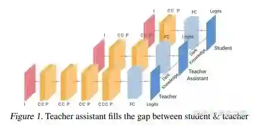 另一个缓解 Capacity Gap 的策略是使用多阶段的蒸馏,一般使用两阶段,引入一个 size 适中的网络,即 Teacher Assistant,作为 Teacher 与 Student 之间的过渡。Teacher 与 TA 以及 TA 与 Student 之间的 Capacity Gap 都不是很严重,先将 Teacher 的知识蒸馏到 TA,再将 TA 的知识蒸馏到 Student,这就避免了 Gap 过大时蒸馏效果出现剧烈 drop 的情况。