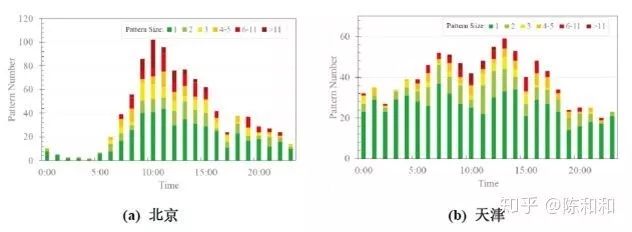 如下图所示,北京的危险品需求内在驱动力为市民的生活需求,因此危险模式的时间分布和市民作息高度相关,具有有着很强的节律性;而天津的危险品需求为进出口工业需求,由于港口能够进行三班倒的连续运营,因此天津的危险模式在时间上的分布比较均匀。