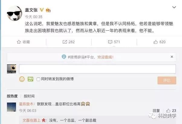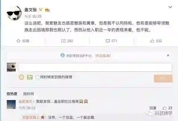 盖文张微博原文为:这么说吧,我爱魅友也感恩魅族和黄章,但是我不认同杨柘,他若是能带领魅族走出困境那我也就认了,然而从他入职一年的表现来看,他不能。