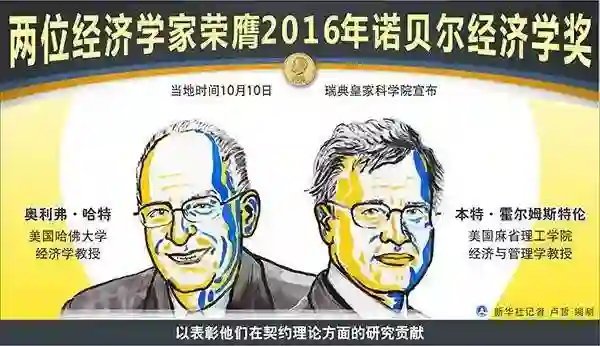 将经济学奖颁给了两位经济学家Hart和Holmstroem,以表彰他们在契约领域做出的巨大贡献。霍尔姆斯特伦教授在20世纪70年代的契约理论研究以及哈特之后发展的不完全契约理论,对于理解现实生活中的契约与制度以及契约设计中的潜在缺陷具有很高价值,且在经济学、社会学、乃至法律、政治等领域都有着十分广泛的应用。