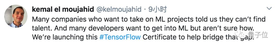 TensorFlow产品负责人kemal el moujahid说,推出这个认证主要是一些公司想搞机器学习却招不到人,一些人想学机器学习却不太知道怎么开始,所以就搞个官方认证来牵线搭桥。