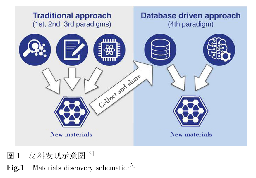 材料的发展长期以来受到各国的重视,新材料的发现往 往能带动社会的跨越式进步[1] 。由于材料内在关系的复杂 性,传统的材料研究方法存在周期长、成本高以及具有一定 偶然性等不足,无法满足当下对材料研发的需求[2] 。20 世纪 90 年代开始,得益于计算机技术的革新,以数据为基础、机器 学习为核心的数据驱动科学成为继实验科学、理论归纳、计 算仿真后的科学发现的第四范式(如图1[3] 所示),其能处理 大量数据之间隐藏的相关性而忽略复杂的内在机理,从而缩 短研发周期,降低成本。而“材料基因组计划(MGI)”的推 行,更是促进了数据驱动技术在材料中的应用发展,其核心是通过高通量的实验与计算来产生大量数据,并应用大数据 技术进行数据存储、挖掘,来获取有价值的规律[4⁃5] ,在专家 经验和理论指导下转化成可靠的知识,从而得到材料成分— 工艺—结构—性能之间的关系[6⁃7] ,为新材料设计和材料改 性提供依据。