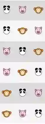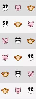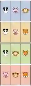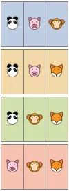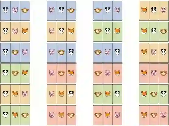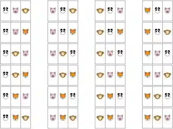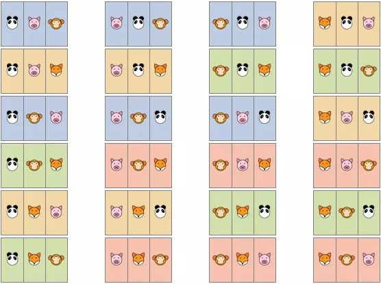 请注意上图共有 4 种背景, 每种背景的小动物种类是相同的, 只不过顺序不同. 以浅蓝色背景的熊猫君, 猪弟, 猴哥为例. 如果考虑顺序的话, 共出现 6 边, 也即是 3! . 所以对于组合而言, 要将排列数中除以重复倍数 3!, 即组合数为 4. 下图即为 4 取 3组合结果等于 4: