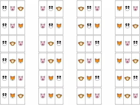 先按第一步进行排列计算, 将熊猫君, 猪弟, 猴哥, 狐娘取出 3 个进行排列, 所有的排法共 4!=24 种, 如下图所示: