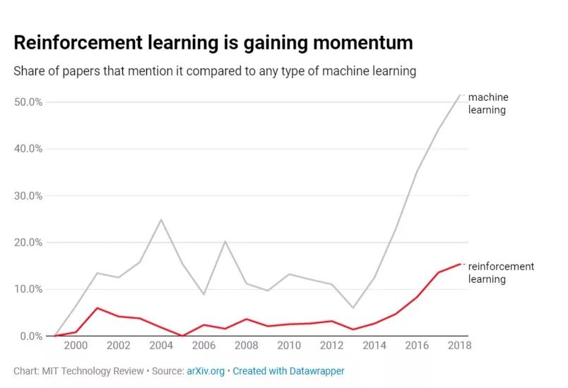《麻省理工科技评论》发现,最近几年中,提及强化学习的论文数量大幅上升,强化学习论文在人工智能论文中的占比从2015年的4.7%上升为2018年的15.3%。