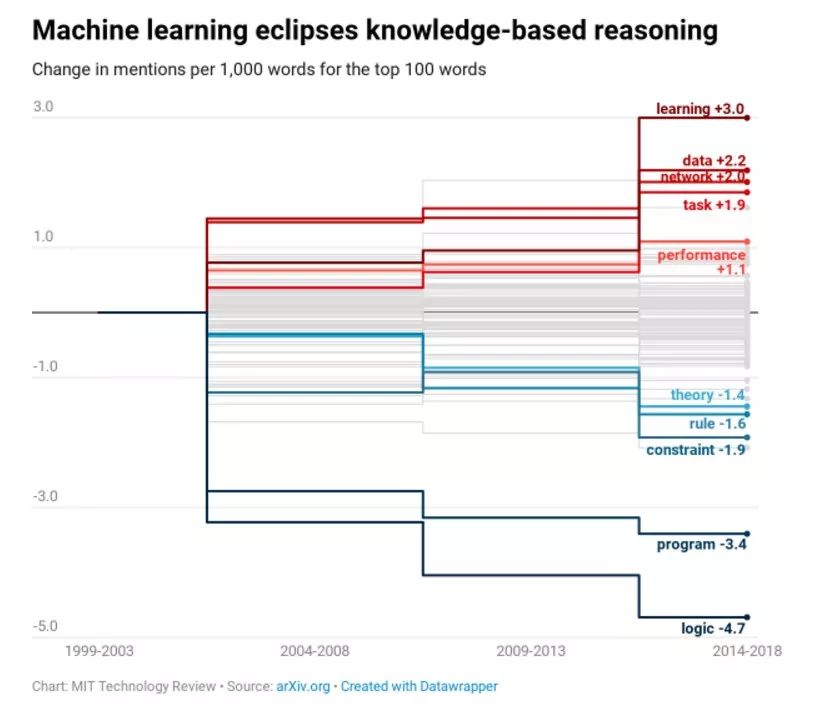 上述报告发现,在20世纪90年代末至21世纪初的人工智能论文中,“逻辑”、“规则”等与知识系统相关的词,数量开始下降,而“数据”、“网络”、“性能”等与机器学习相关的词汇出现的次数快速增长。