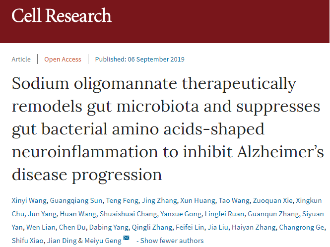2019年9月6日,中国科学院上海药物所耿美玉团队的一篇研究登上了被称为“国刊之光”的Cell Research(今年IF首次突破20)封面。研究题为“Sodium oligomannate therapeutically remodels gut microbiota and suppresses gut bacterial amino acids-shaped neuroinflammation to inhibit Alzheimer’s disease progression”,封面用一句话概括了GV-971的原理:通过重建肠道菌群,来治疗阿尔茨海默病 (AD)。