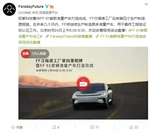 【法拉第未来:FF91首款准量产车打造完成】23日法拉第未来宣布,FF91首款准量产车打造完成,将于北京时间24日上午8:00-9:00进行下线仪式,在未来几个月内,FF将继续生产制造更多准量产车,用于最终工程验证和认证工作。