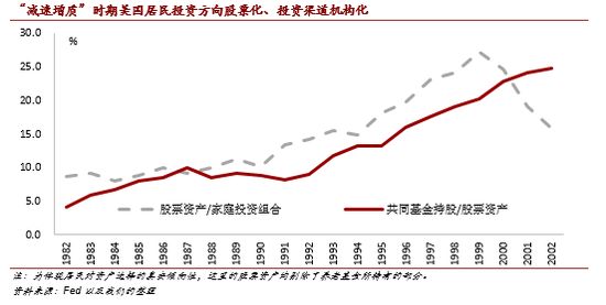 其一,市场结构改善。1982-2002年期间,得益于经济“增质”对投资需求和投资标的的同步优化,美国居民在投资方向上逐步向股市加码,在投资渠道上从直接投资股票转向通过共同基金进行间接投资,因此机构投资者开始迅速取代个人投资者。据美联储工作论文测算[2],从1982年至2002年,在剔除养老金账户所持有股票的影响后,股票占居民投资组合的比重从近9%上升至15%;而在这部分股票中,由共同基金所持有的比例从4%跃升至近25%,大幅挤占了个人投资者的份额。