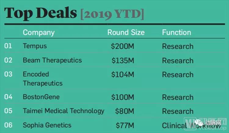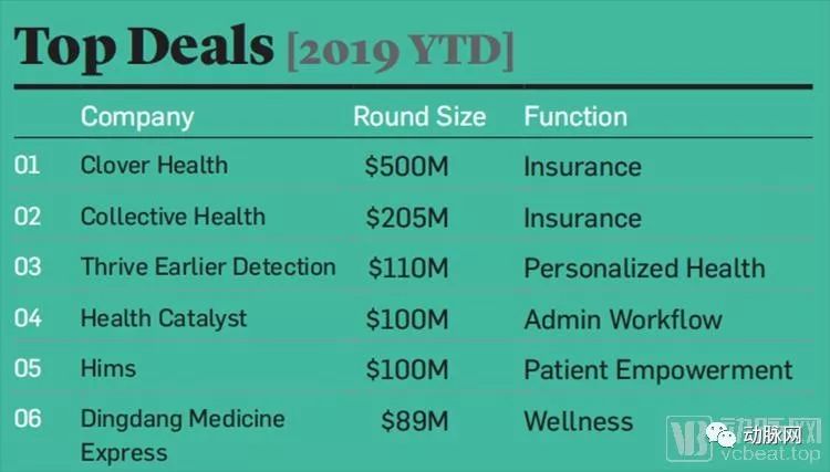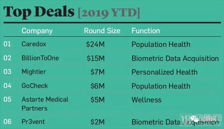 动脉网根据StartUp Health的半年报,整理了在2019年上半年11个细分医疗领域的投融资情况。