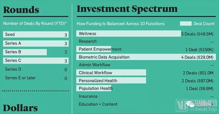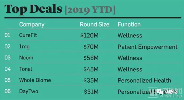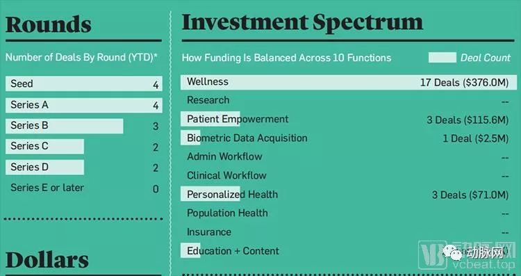 从交易轮次和投资者投资的频率来看,A轮和种子轮融资占比最大,都有4次;Wellness (健康)获得的投资次数最多,有17次投资,投资总额达到3760万美元。而在该领域投资数额最大的几笔投资如下图所示。