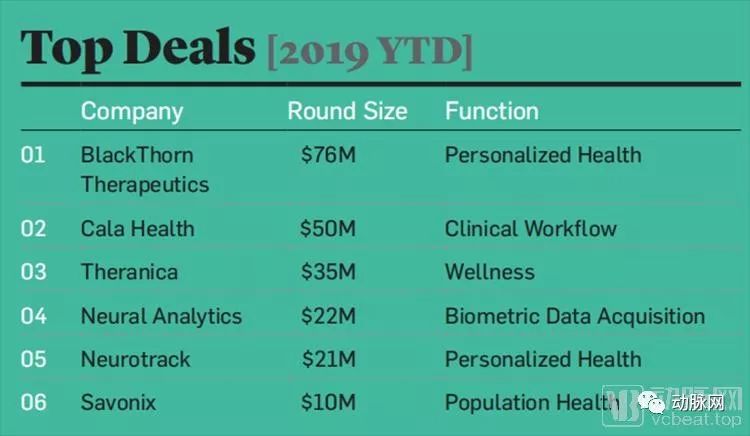 从交易轮次和投资者投资的频率来看,A轮融资和B轮融资占比分列一二,分别有20次的19次;Biometric Data Acquisition(生物识别数据采集)和Clinical Workflow(临床工作流程)获得的投资次数并列第一,都有15次投资,投资总额分别达到了1.64亿美元、2.86亿美元。而在该领域投资数额最大的几笔投资如下图所示。