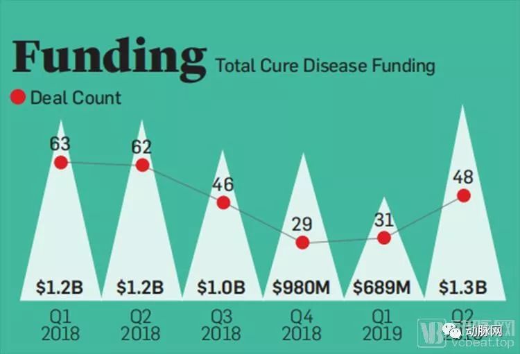 在“治疗疾病”领域,资金和交易数量已经在多个季度下降,到2019年6月有所增加,季度资金增加了90%,交易数量上涨了55%。