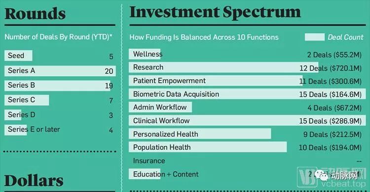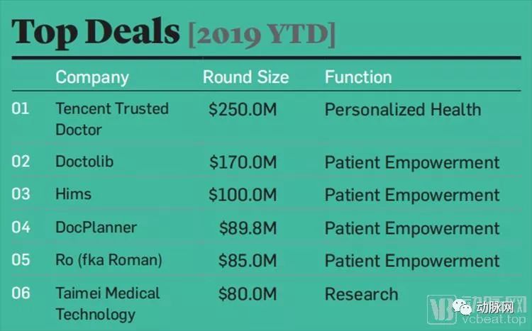 从交易轮次和投资者投资的频率来看,A轮融资占比最大,有31次;Patient Empowerment(患者赋权)获得的投资次数最多,有50次投资,投资总额达到9.24亿美元。而在该领域投资数额最大的几笔投资如下图所示。