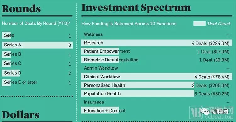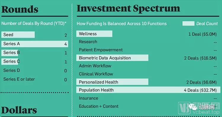 从交易轮次和投资者投资的频率来看,A轮融资占比最大,有4次;Population Health(人口健康)获得的投资次数最多,有4次投资,投资总额达到3270万美元。而在该领域投资数额最大的几笔投资如下图所示。