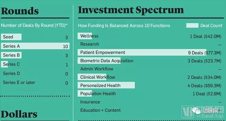 从交易轮次和投资者投资的频率来看,A轮融资占比最大,有10次;Patient Empowerment(患者赋权)获得的投资次数最多,有9次投资,投资总额达到7730万美元。而在该领域投资数额最大的几笔投资如下图所示。