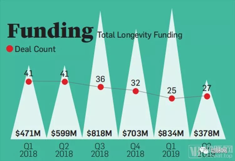 从第一季度到第二季度,长寿领域的资金和交易量在2019年有所下降。融资轮次集中在种子轮,有12笔交易,其次是B轮融资10笔,A轮融资6笔。在今年上半年里,该领域获得融资最多的是Clover Health公司,获得了5亿美元的投资。
