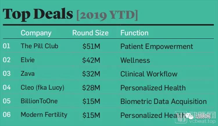 在2019年上半年,该领域总共完成了5次融资,其中三次是投资于Patient Empowerment(患者赋权)上,总计融资6550万美元。而在该领域融资做多的是药物研发公司Pear Therapeutics,该公司完成了6400万美元的C轮融资。