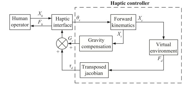 触力觉交互设备是一个完整的机械臂系统,常见的机械结构包括并联的Delta结构、四连杆结构以及串联的连杆结构。本文采用了串并联混联的结构构型,在机械结构上实现了平移和旋转的解耦。基于结构构型运动学和动力学分析,设计了带重力补偿的阻抗控制器,实现了三个平动自由度和一个夹持自由度的力反馈功能。控制器结构如图1所示。