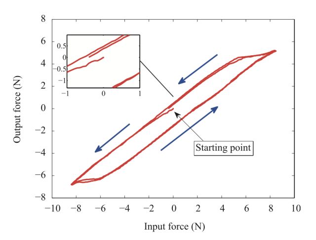 为了快速评估重力补偿算法的效果,本文采用ADAMS模型进行仿真验证。通过ADAMS模型计算结果和数学模型计算结果的对比,验证了重力补偿算法的有效性。为了对该控制器的控制性能进行相关分析,本文对七自由度触力觉交互设备的物理样机进行了实验分析。从重力补偿、输入输出特性以及输出力跟踪性能三方面进行了实验研究。该设备在X轴方向的输入输出特性曲线如图2所示。实验结果表明,该阻抗控制器能够实现反馈力的精确控制和输出。