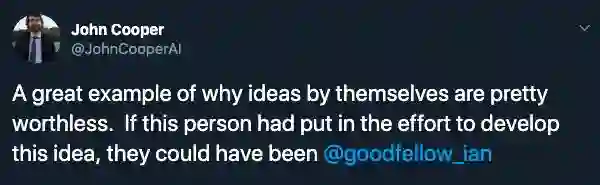 人工智能、机器人、空间科学工程师John Cooper在Twitter阐述了他对此事的观点:点子一文不值,做出成果的人才有话语权。