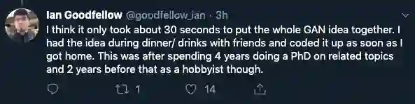 正如Ian所说:我把整个GAN理念放在一起只需要大约30秒钟。但这是建立在我花了4年时间攻读相关领域的博士学位,加上在攻读博士学位之前、用了2年作为业余爱好的基础之上。