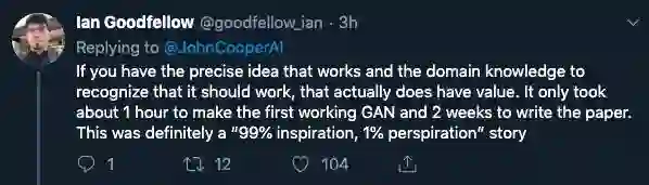 Ian也在下面回复,从侧面认可“做永远比说有价值”:如果你有确切的想法可行,并且领域知识能够认识到它应该有效,那实际上就确实有价值。制作第一个能运作的GAN只花了大约1个小时,写论文只花了2个星期。这绝对是一个“99%灵感,1%汗水”的故事。