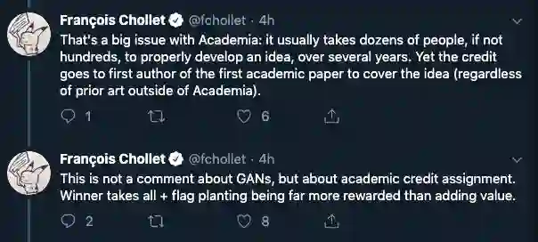 Keras之父François Chollet回复说:这对学术界来说是一个大问题。通常需要数十人(如果不是数百人),花费很多年心血才能正确地发展一个想法。然而,荣誉要归功于第一篇学术论文的第一作者(无论学术界之外的现有技术如何)。