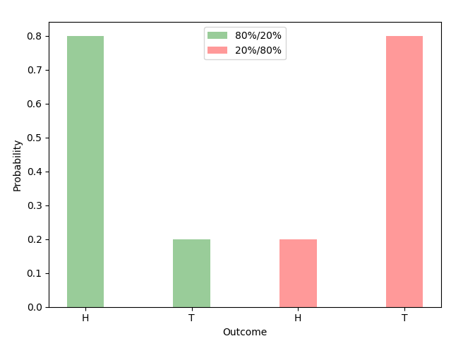 考虑两个特殊的硬币,第一个硬币正面朝上 (H, Head) 的概率为80%,背面朝上 (T, Tail) 的概率为 20%。另一个硬币的正面朝上和反面朝上的概率分别为 60% 和 40%。如果我们同事抛两枚硬币,那么有四种可能:正正,正反,反正,反反。对应的概率分别为[0.48, 0.32, 0.12, 0.08]。