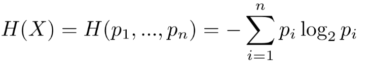 所以在没有特意说明的情况下,下面就是熵的公式。对于事件X,有n种可能结果,且概率分别为p_1, ... p_n,公式为: