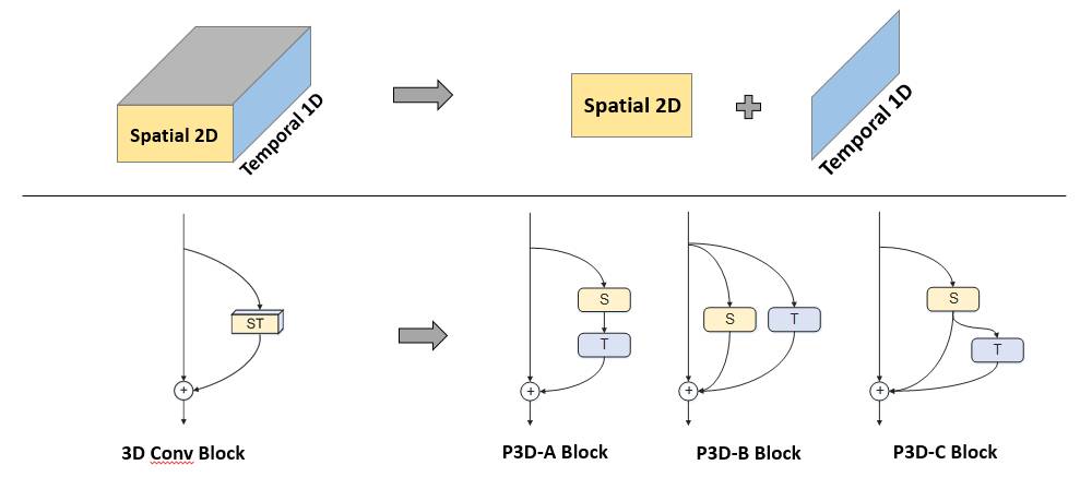 为了解决以上的局限性,我们提出了一系列基于伪三维卷积和残差学习(Residual Learning)的神经网络模块,用以同时在时间和空间上进行卷积操作。其中,伪三维卷积是这个网络结构的核心操作,基本思想是利用一个1*3*3的二维空间卷积和3*1*1的一维时域卷积来模拟常用的3*3*3三维卷积。通过简化,伪三维卷积神经网络相比于同样深度的二维卷积神经网络仅仅增添了一定数量的一维卷积,在参数数量、运行速度等方面并不会产生过度的增长。与此同时,由于其中的二维卷积核可以使用图像数据进行预训练,对于已标注视频数据的需求也会大大减少。结合残差学习的思想,该论文提出三种不同的伪三维卷积残差单元(P3D-A,P3D-B,P3D-C)分别使用串行、并行和带捷径(shortcut)的串行三种方式来确定空间卷积和时域卷积之间的关系。