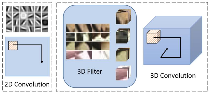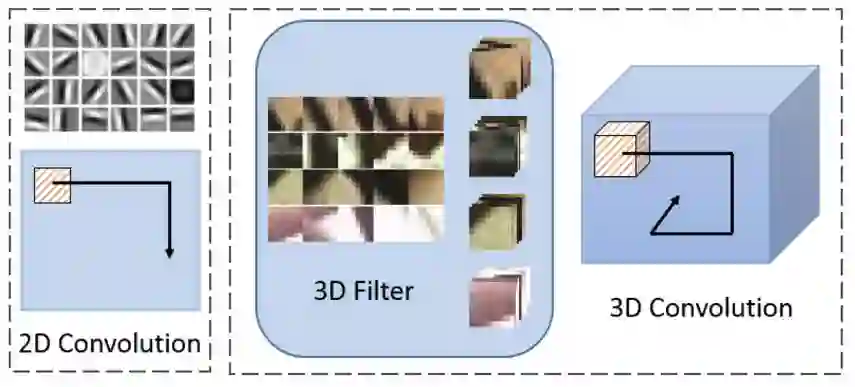 为了使用深度神经网络来提取视频中时间和空间维度上的信息,一种直接的思路就是将用于图像特征学习的二维卷积拓展为三维卷积(3D Convolution),同时在时间和空间维度上进行卷积操作。如此一来,由三维卷积操作构成的三维卷积神经网络可以在获取每一帧视觉特征的同时,也能表达相邻帧随时间推移的关联与变化,如下图所示。