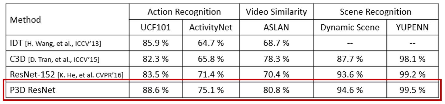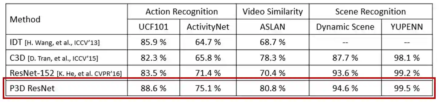 通过使用以上三种伪三维残差单元替代152层ResNet中的二维残差单元,该工作得到了目前最深的199层三维卷积网络结构。最终经过ImageNet数据集中的图片数据和Sports-1M(包含了487个类别的百万级视频片段)[4] 视频数据的训练,该网络在视频动作识别(Action Recognition)、视频相似度分析(Video Similarity)和视频场景识别(Scene Recognition)三个不同的视频理解任务上均获得了稳定的性能提升,并且在CVPR 2017的Activity Net Challenge的Dense-Captioning任务中获得第一名。