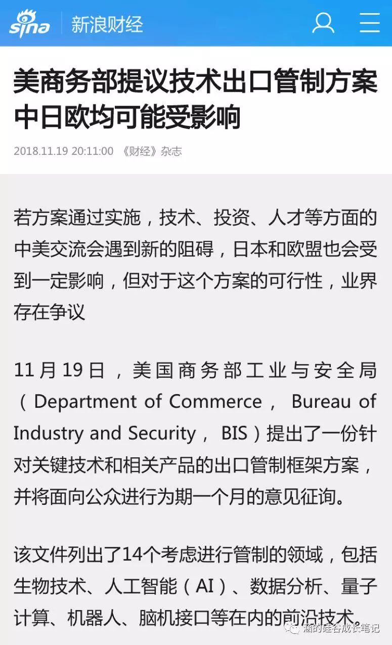 11月19日,美国商务部工业安全局发布了一项,针对“关键”技术出口限制的最新草案,正在征询意见。其中,人工智能技术赫然在列。
