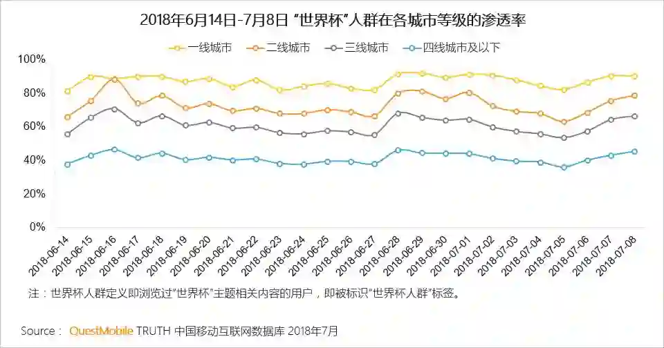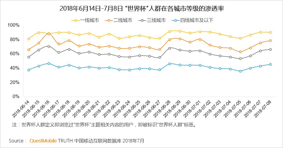 4.1 关注世界杯的移动网民每城市等级逐级下降约15%左右,超过80%的一线城市用户关注世界杯