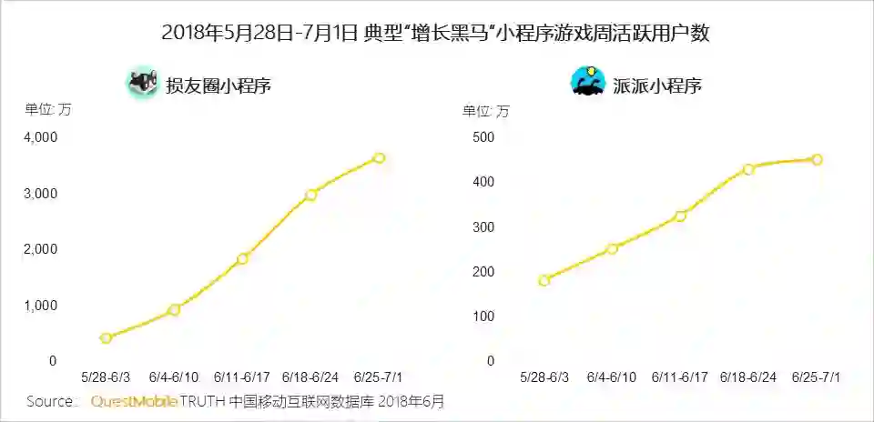 基于微信生态强大的社交连接基础,微信小游戏的发展如火如荼,平均每两三周就会有爆款小游戏问世。以6月为例,据QuestMobile数据监测,损友圈和派派是增长最快的小程序游戏之一,其中损友圈已跻身小程序2018年6月MAU TOP10 。