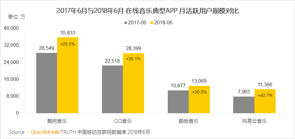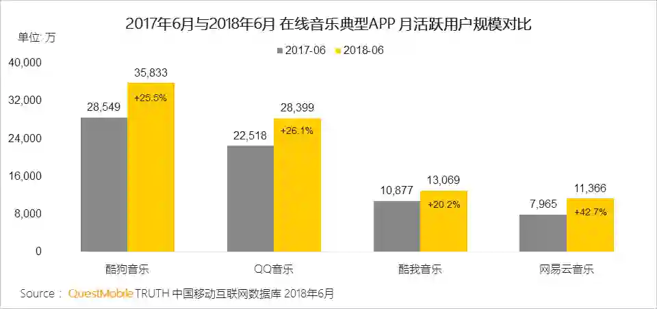 在线音乐行业竞争格局保持稳定:腾讯系用户量持续增加,而版权方面处于弱势的网易云音乐也凭借良好的社群氛围、智能推荐等特点保持快速增长。