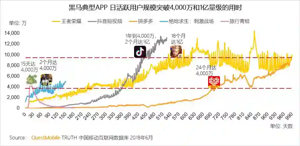 内容为王的时代给了新的产品绝佳的发展机遇,新的典型APP“爆发力”增强,对百万级、千万级用户的获取时间越来越短,旅行青蛙半个月的时间达到4,000万日活跃用户规模,抖音短视频日活跃用户规模从4,000万增长到1亿仅用时2个月。